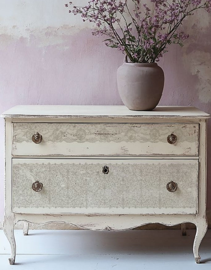 The 12×12" Lace Stamp is sourced from authentic vintage lace and refined for crisp detail and contrast. Designed with seamless edges for easy tiling, it creates elegant all-over patterns for furniture, walls, and statement décor. Featuring three lace designs in varied scales, it offers versatility for bold coverage or subtle, textured accents in mixed media projects.
